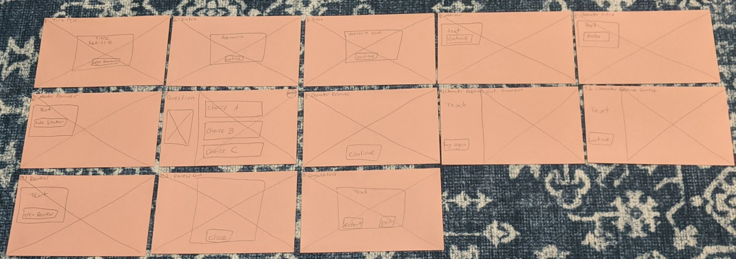 I wrote the text-based storyboard in Google Docs. I wanted to be as detailed as possible during this process so I would know exactly what to develop in the scenario, including the visual notes and programming notes.