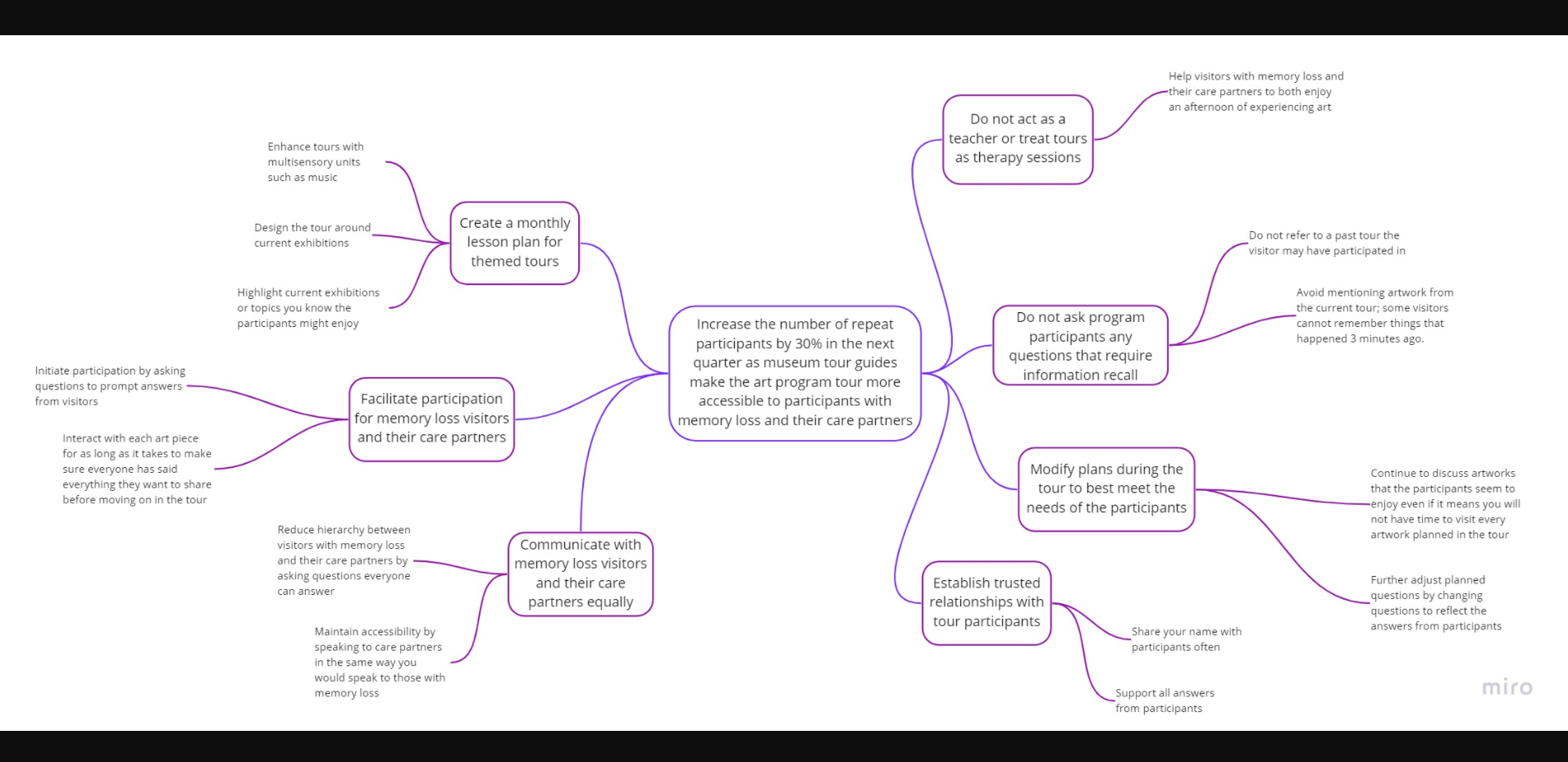 I created the action map based on Cathy Moore’s Map It. I used the framework of Bloom’s Taxonomy to create an action map of the specific actions the tour guides need to take and details of what each action successfully looks like. I created this action map using Miro.